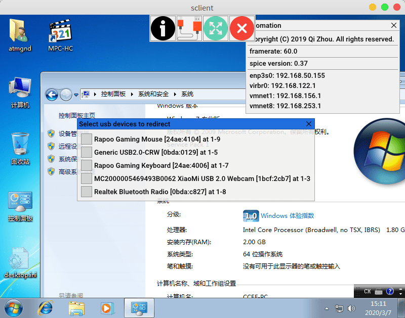 - USB重定向测试. sclient 集成了spice usb重定向功能